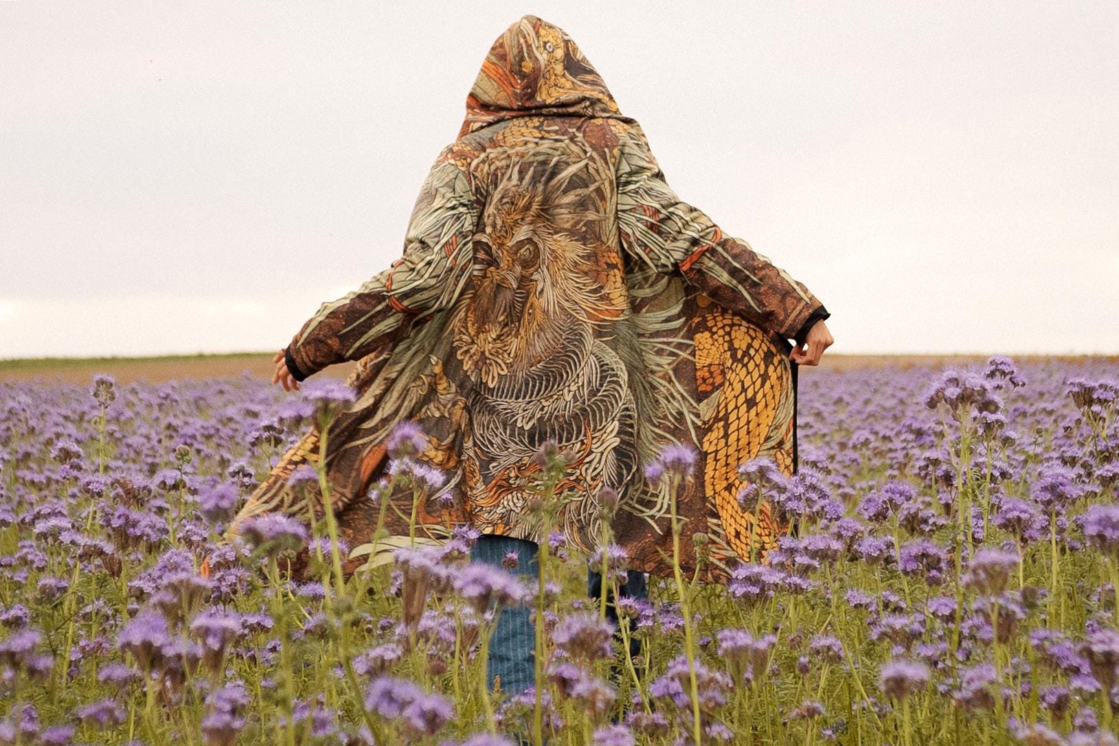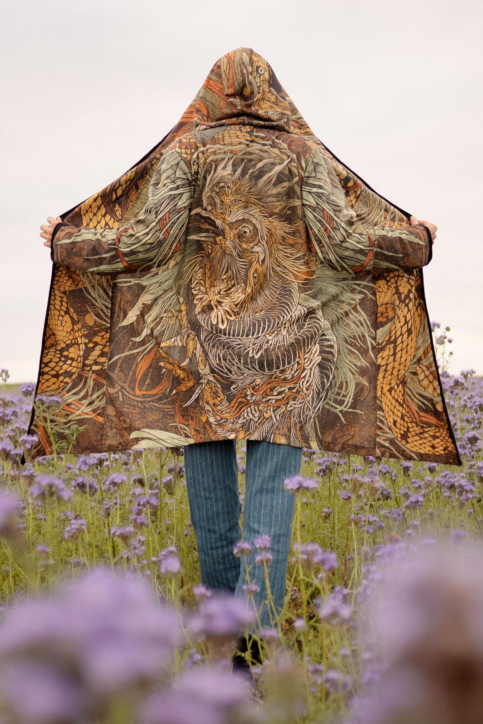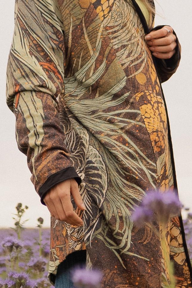 • Every assassin coat is sublimation printed with special design of Kusen aka The mighty battle between the rooster and the rattle snake - hand drawn by BENZE and sewn by hand in Hungary • Comes with a printed bag in the same fabric • Has pockets • Vibrant print will never fade with wear or washing • Requires hand wash or in its bag in 30 degrees, hang to dry, iron carefully with low temperature